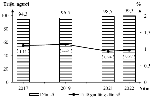Biểu đồ số dân và tỉ lệ gia tăng dân số nước ta, giai đoạn 2017 - 2022