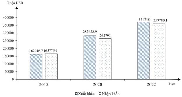 Biểu đồ trị giá xuất khẩu và nhập khẩu hàng hóa của Việt Nam giai đoạn 2015 – 2022