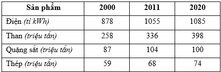 Câu 506 : Cho bảng số liệu về sản lượng một số sản phẩm công nghiệp của Liên bang Nga giai đoạn 2000 – 2020: