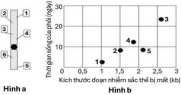Câu 3: Trong một thí nghiệm, các nhà khoa học đã xử lý phôi của một loài côn trùng gây đột biến mất đoạn NST ở 6 vị trí khác nhau (từ 1 đến 6 như Hình a). Theo dõi thời gian sống của các phôi mang đột biến mất đoạn tương ứng các vị trí thể hiện qua đồ thị Hình b. Kích thước đoạn bị mất tính theo đơn vị nghìn cặp nucleotide (kb). Biết sự phân bố các gene trên NST là tương đối đều nhau, phôi mang đột biến mất đoạn ở vị trí 6 vẫn sống và phát triển thành cơ thể bình thường.
