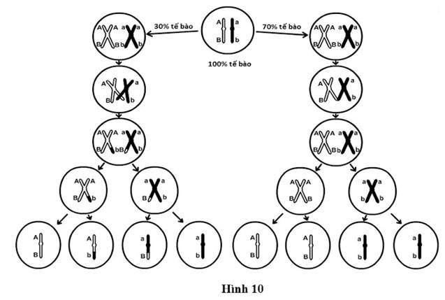 Câu 5: Ở một loài côn trùng, allele A quy định thân xám trội hoàn toàn so với allele a quy định thân đen, allele B quy định mắt đỏ trội hoàn toàn so với mắt trắng. Cho hai cá thể thuần chủng khác nhau bởi các cặp tính trạng tương phản (P), thu được thế hệ F1. Tiếp tục cho các cá thể F1 giao phối với nhau, thu được thế hệ F2. Biết quá trình giảm phân của các cá thể F1 được mô tả như Hình 10. Tính theo lí thuyết, Ở F2, các cá thể mang kiểu gene đồng hợp trội chiếm tỉ lệ bao nhiêu phần trăm? ( làm tròn đến 1 chữ số sau dấu phẩy).