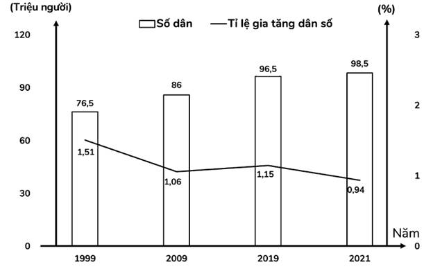 Câu 510 (VD): Biểu đồ sau thể hiện nội dung nào về số dân và tỉ lệ gia tăng dân số của nước ta giai đoạn 1999 - 2021?